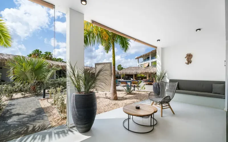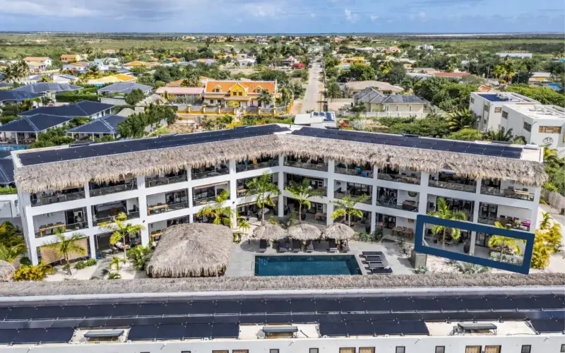 Beschrijving Modern en stijlvol appartement op de begane grond van het boutique vakantieresort Belnem House (2023). Dit volledig gemeubileerde 2-slaapkamer appartement beschikt over een lichte woonkamer met open keuken en heeft vanaf de porch direct toegang tot het zwembad. Een mooie investering en tegelijk een leuk verblijf op Bonaire. Lay-out Het appartement heeft een woonoppervlakte van 94 m² en kenmerkt zich door een moderne en luxe afwerking. De woonkamer staat in verbinding met de keuken, de keuken is opgetrokken uit beton en voorzien van hoogwaardige inbouwapparatuur en een kookeiland. Aan de voorzijde van het appartement is de ruime, overdekte porch die zich uitstrekt over de volledige breedte van het appartement. Hier is voldoende ruimte voor een zit- en loungegedeelte, met directe toegang tot het gezamenlijk zwembad en de tropische tuin. De twee slaapkamers zijn van elkaar gescheiden via de gang, wat zorgt voor extra privacy. De badkamer is uitgerust met een regendouche, wastafel en toilet. Daarnaast beschikt het appartement over airconditioning in beide slaapkamers, rookmelders en een praktische eigenaarskast. Het resort is rondom een tropisch aangelegde binnentuin gesitueerd en beschikt over een gezamenlijk zwembad en een gezellige palapa-bar. In het complex is geen lift aanwezig. Belnem House is volledig off-grid ontworpen en daarmee zelfvoorzienend in energie. Door het gebruik van zonnepanelen en zonneboilers zijn de appartementen onafhankelijk van het elektriciteitsnet en wordt op een duurzame manier voorzien in stroom en warm water. Het resort bestaat uit 18 appartementen en 13 studio’s en is gelegen op een zichtlocatie in de populaire wijk Belnem. Het geheel is gebouwd op een eigendomskavel van 3.619 m². Permanente bewoning is volgens de VvE-statuten niet toegestaan. Technische details Binnen de VvE is er geen eigenaar met een meerderheidsbelang van meer dan 50% van de stemmen. Sinds de oplevering in 2023 heeft het resort zich snel bewezen als een aantrekkelijke verhuurlocatie, met een gemiddelde bezettingsgraad van circa 75% vanaf 2024. Verhuur vindt plaats via Belnem House Bonaire Bezit & Beheer BV. Het appartement maakt onderdeel uit van een actieve VvE die zorg draagt voor het onderhoud, personeel en verzekeringen. De verhuur loopt via diverse kanalen zoals Booking.com, Expedia, Corendon en de eigen website. Eigenaren ontvangen periodiek inzicht in de prestaties, waaronder omzet, kosten, bezettingsgraad en aantal boekingen. Voor het beheer wordt een managementfee in rekening gebracht. De huuropbrengsten worden per kwartaal verrekend met de kosten en eventueel eigen gebruik. Op basis van de huidige bezettingsgraad en kosten kan het nettorendement conservatief worden geschat op circa $ 1.400 per maand. Oppervlakte appartement (94 m2):# Leefgedeelte: 6,8 x 10 = 68 m2# Porch: 2.6 x 10 = 26 m2 Reviews:Tripadvisor 5,0 op schaal 1-5 (van 93 beoordelingen)Expedia: 9,6 op schaal 1-10 (van 54 beoordelingen)Booking: 9,4 op schaal 1-10 (van 125 beoordelingen)Hotels.com: 9.6 op schaal 1-10 (van 54 beoordelingen) Pluspunten + volledig gemeubileerd+ vakantieverhuur toegestaan+ bezettingsgraad 2025 boven 75%+ riant overdekt terras met uitzicht+ loopafstand van Bachelor Beach Omgeving Belnem House is gelegen in de populaire omgeving van Belnem op 200 meter loopafstand van Bachelor Beach en op korte afstand van de windsurf- en kitesurf stranden. Er zijn volop duikscholen in de omgeving en Belnem House is zeer gunstig gelegen voor de shore dive locaties in het zuiden van Bonaire. Het centrum van Kralendijk met zijn voorzieningen is binnen 10 minuten met de auto te bereiken. Bestemmingsplan Bekijk de plankaart: Ruimtelijk Ontwikkelingsplan BonaireLees de bestemmingsplan omschrijving: Gemengd-IV