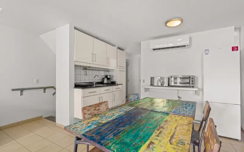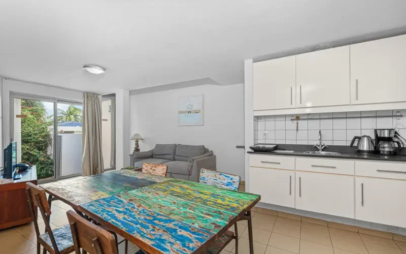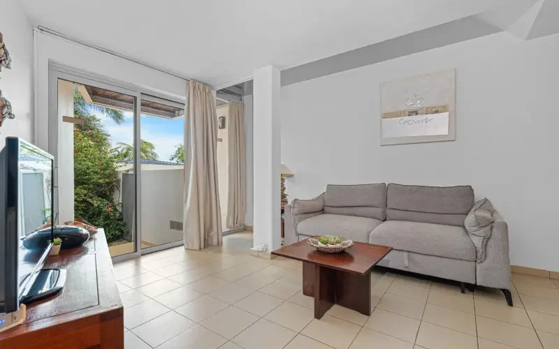 De woning bevindt zich in de linkerzijde gebouw van het complex, aan de centrumzijde. Door de bijna ovaalvormige opzet van dit gebouw heeft het appartement een langgerekte indeling. Na een aantal treden vanaf de straatkant betreedt men de woning. Bij binnenkomst betreedt men de open keuken met aansluitend de woonkamer, welke aansluit op een eigen tuin. De slaapkamer is uitgerust met ingebouwde kasten en airconditioning. De badkamer is voorzien van een douche, toilet en wastafel. Wanneer u de trap naar beneden loopt, komt u in souterrain waar zich nog een ruime slaapkamer bevindt met een en-suite badkamer. Een 3e slaapkamer is aanwezig, allen voorzien van een airconditioner. Middels een trap heeft u toegang tot het souterrain.