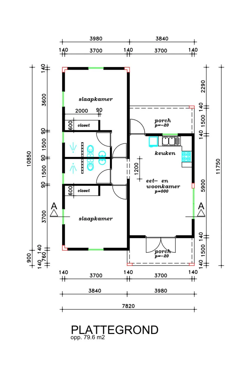 When you enter the house, you first enter the living room with the kitchen in the back of the room. The house has a high ceiling, which makes the rooms feel more spacious. A door has been placed next to the kitchen, which leads to the porch at the rear of the house. On the left is a hallway, on this side of the house there are 2 bedrooms and 2 bathrooms. The bathrooms have the same stylish and sleek appearance as the kitchen.