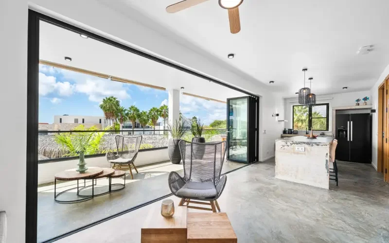 Lay-out Modern appartement op de eerste verdieping van het boutique-stijl vakantiecomplex Belnem House (2023). Dit volledig gemeubileerd appartement met 2 slaapkamers heeft een woonkamer met open keuken. Vanaf de ruime porch is er uitzicht op het zwembad. Twee-slaapkamer appartement van 94 m². De indeling omvat een woonkamer met open keuken, vervaardigd uit beton met luxe apparatuur en een kookeil...
