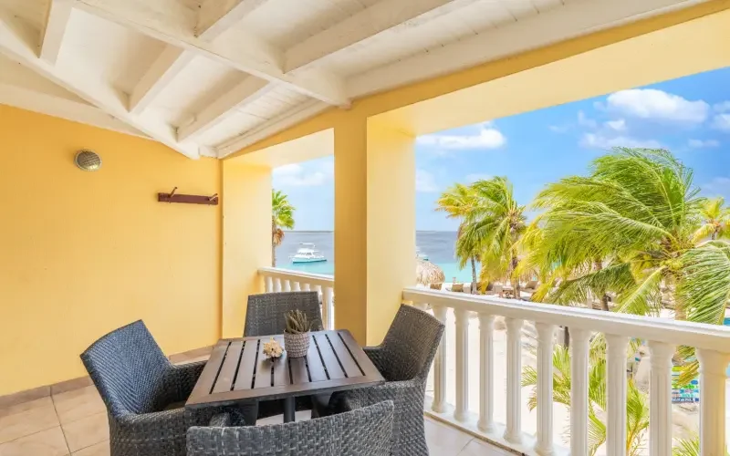 Aan de oceaanzijde is de lange woonkamer met 2 openslaande deuren naar het terras. De ruime porch met zeezicht is gunstig gelegen met zicht op de ondergaande zon. Daarnaast is er zicht op Blenny’s, het zwembad, ruime tropische tuin en Klein Bonaire.