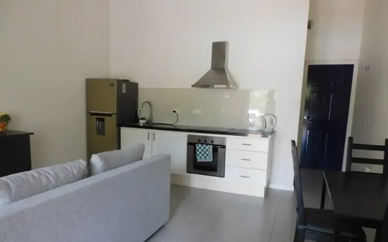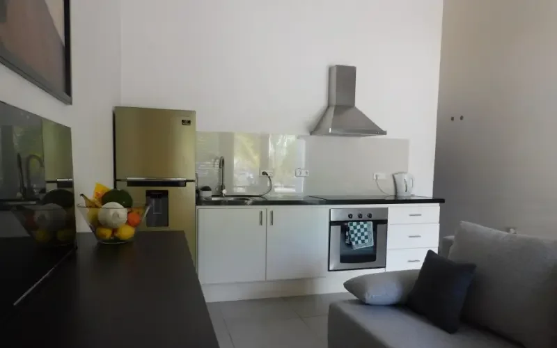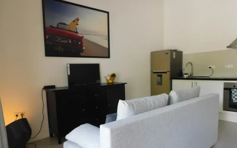 De woonkamer is voorzien van een slaapbank, een ladekast met tv en een eettafel met 4 stoelen. De open keuken heeft een plafondventilator, een grote koelkast, een elektrische kookplaat, een afzuigkap en een oven. De badkamer heeft een dubbele wastafel en een regendouche, en er is een wasmachine aangesloten. De slaapkamer heeft een tweepersoonsbed en een ruime open kledingkast. De slaapkamer is voorzien van airconditioning.