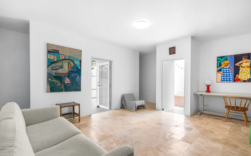 De binnentuin die via de keuken bereikbaar is geeft toegang naar de tweede slaapkamer en naar de woonkamer. De twee slaapkamers zijn qua afmeting en inrichting identiek aan elkaar, maar de gastenkamer heeft tevens een eigen entree naar buiten. De woonkamer heeft net als de keuken 2 nissen en biedt veel schaduw, mede door het uitzicht op de boom.