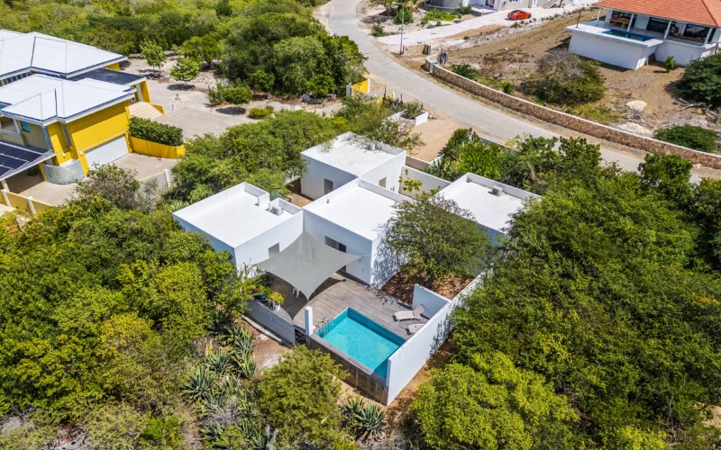 Beschrijving Villa in Sabadeco met een uniek design en weids uitzicht op zee. Deze woning met zwembad heeft 2 slaapkamers en 2 badkamers. Wonen bij de ingang naar de Wayaka trail, een heerlijk uitgangspunt voor een mooie wandeling door de ongerepte natuur. Lay-out Binnenkomst is via de entree aan de zijkant. Alle ruimtes van deze villa zijn qua grootte identiek en hebben een vierkant design. De keuken is de centrale plek van het huis en heeft 3 eenvoudige RVS keukenblokken. Ook zijn er 2 nissen: wasruimte en bergruimte. Ideaal om spullen uit zicht op te bergen. In de keuken zijn nog 2 deuren naar de binnentuin en naar het pooldeck. Het terras bij het zwembad heeft een houten vloer en een mooi uitzicht op zee en Crown Terrace. Een zonnedoek zorgt voor enige schaduw op het terras. Er is een buitendouche aanwezig en een opvallende boom: de Palu di Brasil. Alle kamers zijn voorzien van een natuurstenen vloer wat in 2024 door de gehele woning gelegd is. Via het pooldeck is er toegang tot een van de slaapkamers. De indeling van de slaapkamer is zo ontworpen dat er in elke hoek een open ruimte is voor onder andere een toilet, wastafel, berging en douche. De binnentuin die via de keuken bereikbaar is geeft toegang naar de tweede slaapkamer en naar de woonkamer. De twee slaapkamers zijn qua afmeting en inrichting identiek aan elkaar, maar de gastenkamer heeft tevens een eigen entree naar buiten. De woonkamer heeft net als de keuken 2 nissen en biedt veel schaduw, mede door het uitzicht op de boom. Deze villa is in 2016 gebouwd op een perceel van 1.823 m2 eigendomsgrond. Er is gelegenheid om de auto op eigen terrein te parkeren. Technische details Het betonnen dak is in 2024 volledig gecoat. Het zwembad (chloor) heeft een afmeting van ca 575 x 310 cm, de zwembadpomp en filter zit onder het terras. Alle badkamers zijn in 2024/2025 gemoderniseerd. De woning beschikt over 4 inverter airconditioners, volledig 220V en een boiler. Er is een septictank aanwezig. Pluspunten + Zeezicht+ Woonkamer met airconditioning+ Zwembad met uitzicht+ Privacy Omgeving De luxe wijk Sabadeco ligt op circa 10 minuten van het centrum van Kralendijk. Deze woning ligt vrijwel naast de ingang van de Wayaka trail, vanwaar je wandelingen kunt maken naar Seru Largu of helemaal tot aan Arawak. In de nabijgelegen wijk Hato zijn diverse restaurants en een supermarkt. Voor de liefhebbers van de zee zijn er volop mogelijkheden binnen handbereik om te kunnen snorkelen of duiken. Bestemmingsplan Bekijk de plankaart: Ruimtelijk Ontwikkelingsplan BonaireLees de bestemmingsplan omschrijving: Woongebied-III
