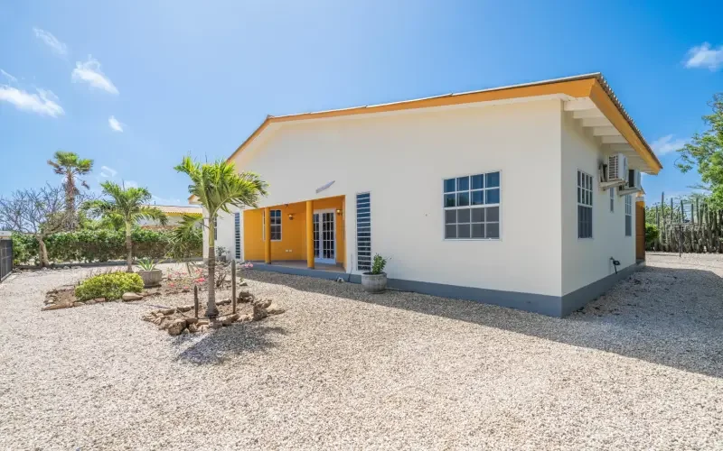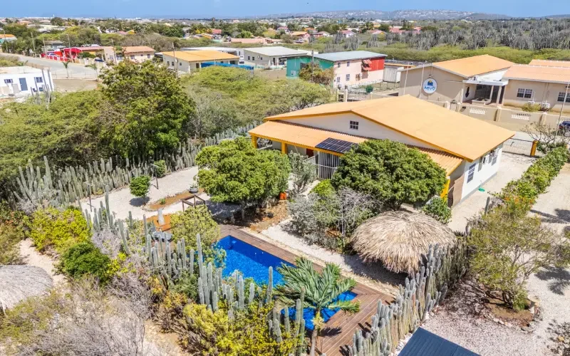 Beschrijving Twee gemeubileerde appartementen onder 1 dak met een zwembad en palapa in de tuin, gebouwd op bijna 800 m2 eigendomsgrond. Een fantastische mogelijkheid om zelf wonen te combineren met verhuur. Iedere appartement van circa 73 m2 woonoppervlakte heeft 2 slaapkamers en 1 badkamer. Lay-out Het van steen opgetrokken woonhuis heeft bij de hoofdingang een kleine porch. Vanuit de hal is links de entree naar appartement 1, Kas Iguana en rechts naar appartement 2, Kas Kadushi . Tussen de appartementen ligt een ruime berging en de kavel is volledig omheind. Bij binnenkomst van het linker appartement (Kas Iguana) is er een woonkamer met open keuken. Deze kamer heeft een hoog plafond, wat zorgt voor een ruimtelijk effect. De compacte keuken ligt aan de achterzijde en heeft ramen naar de tuin en berging. De L-vormige betonnen keuken beschikt over houten frontjes/laden en vrijstaand apparatuur. De keuken geeft toegang tot het ruime terras met zit- en eetgelegenheid. De porch heeft de volledige breedte van het appartement en biedt een mooi zicht op de tropische tuin. De woning is volledig gemeubileerd, voorzien van een moderne vloertegel door het hele huis. Er zijn tevens screens voor de ramen en deuren. De twee slaapkamers met airco delen een badkamer in het midden en zijn gelegen aan de buitenzijde van de woning. Deze kamers hebben een verlaagd plafond, waardoor de kamers sneller koel zijn. Het tweede appartement aan de rechterkant, Kas Kadushi, is gespiegeld en vrijwel identiek als Kas Iguana. Tussen de twee appartementen ligt een ruime berging die alleen vanaf de achterzijde bereikbaar is, afgesloten met een stalen poort. In het eerste deel is een spoeltank voor duikers, een buitendouche en ruimte om natte duikuitrusting op te hangen. In het tweede deel kan een wasmachine geplaatst worden. Het achterste deel bestaat uit een afsluitbare berging met daarboven een opbergzolder. Deze tussengelegen opslagruimte zorgt ervoor dat de appartementen niet gehorig zijn en er de nodige privacy is op ieder terras. Aan de voorzijde van de woning is een nette tuin met twee toegangspoorten. Hier is aan beide zijde gelegenheid om te parkeren op eigen terrein. Aan de achterzijde staan veel tropische en volwassen planten en de tuin is volledig voorzien van een dripsysteem. Er is een relatief lang zwembad (chloor) die recent (2026) voorzien is van nieuwe Aquabright poolcoat. De woning beschikt tenslotte over 5 zonnepanelen en is per direct beschikbaar. Technische details Ieder appartement heeft een eigen aansluiting voor water en elektra. Beide appartementen hebben een buiten kraan aan de zijkant van de woningen. Het zwembad (diepte: 140 cm) is circa 8 bij 3 meter en heeft rondom een houten pooldeck met ondergelegen pompruimte. In de gehele woning is 110V en 220V aanwezig en het is reeds voorbereid voor een centrale boiler. Momenteel heeft alleen de badkamer van Kas Iguana een heater om warm te kunnen douchen. Verhuurindicatie: $ 1.500 á $ 1.750 per appartement. Oppervlaktes (totaal bebouwd 175 m2):# Kas Kadushi (48): 73 m2 incl porch achter# Kas Iguana (48a): 73 m2 incl porch achter# Entree: 6,5 m2# Centrale berging: 22,5 m2 (+ 6 m2 zolderberging) Pluspunten + 2 appartementen onder 1 dak+ volledig gemeubilieerd+ goede verhuurmogelijkheid+ per direct beschikbaar+ 5 zonnepanelen+ zwembad (poolcoat 2026)+ volwassen tuin met dripsysteem+ omheind met cactushaag Omgeving Kaminda Jato Bako is een geasfalteerde straat die ligt in het verlengde van de Kaya Nikiboko Noord. Het centrum van Kralendijk ligt op circa 5 minuten met de auto, het vliegveld en populaire stranden zoals Te Amo Beach en Donkey Beach op 10 minuten rij afstand. Deze woning ligt nabij scholen, sportvelden en supermarkten. Bestemmingsplan Bekijk de plankaart: Ruimtelijk Ontwikkelingsplan BonaireLees de bestemmingsplan omschrijving: Woongebied-I