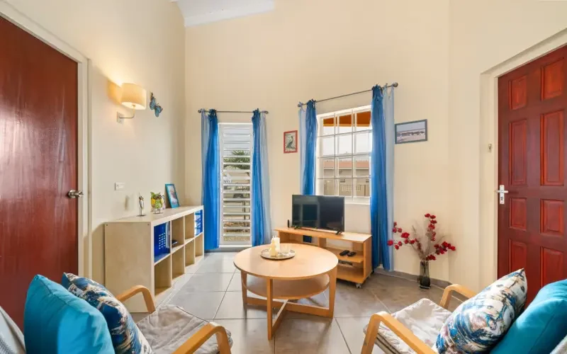 De woning is volledig gemeubileerd, voorzien van een moderne vloertegel door het hele huis. Er zijn tevens screens voor de ramen en deuren. De twee slaapkamers met airco delen een badkamer in het midden en zijn gelegen aan de buitenzijde van de woning. Deze kamers hebben een verlaagd plafond, waardoor de kamers sneller koel zijn. Het tweede appartement aan de rechterkant, Kas Kadushi, is gespiegeld en vrijwel identiek als Kas Iguana.