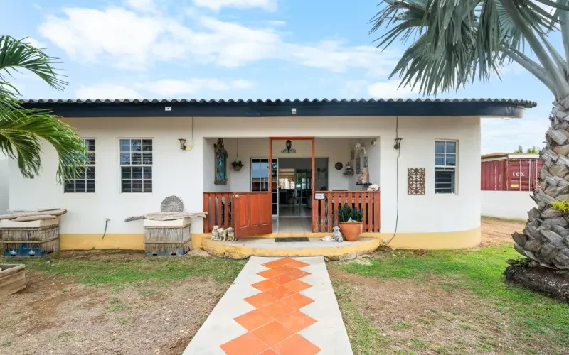 Lay-out Gelegen aan een geasfalteerde weg nabij scholen en supermarkten. Buiten de stenen afscheiding is volop ruimte om meerdere auto’s op eigen terrein te kunnen parkeren. Opvallend aan deze “Cas di porchi” (portiekhuis) is dat er een ronde muur is rechtsvoor. Dit geeft het huis een speels effect. Hoofdwoning met eigen entree Via de overdekte porch met zithoek is er toegang tot de L-vormige woon...