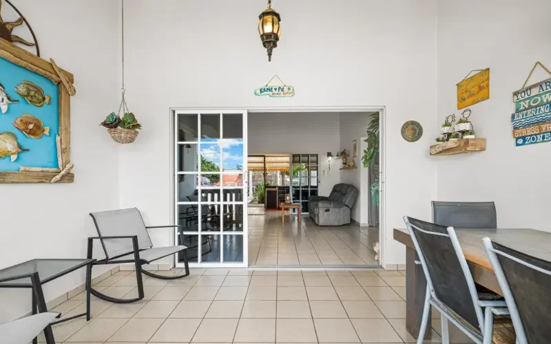 Via de overdekte porch met zithoek is er toegang tot de L-vormige woonkamer met open keuken, achterdeur en schuifdeuren aan voor- en achterzijde. De woonkamer met hoog plafond is voorzien van een airconditioner en ventilator, wat door de aanwezigheid van zonnepanelen ideaal is om het overdag ook lekker koel in huis te hebben. De U-vormige keuken is recent voorzien van nieuw inbouwapparatuur, waaronder een inbouwoven en inductiekookplaat. Aan de achterzijde is een tweede royale porch met eethoek, lounge gedeelte en vaste buitenbar.