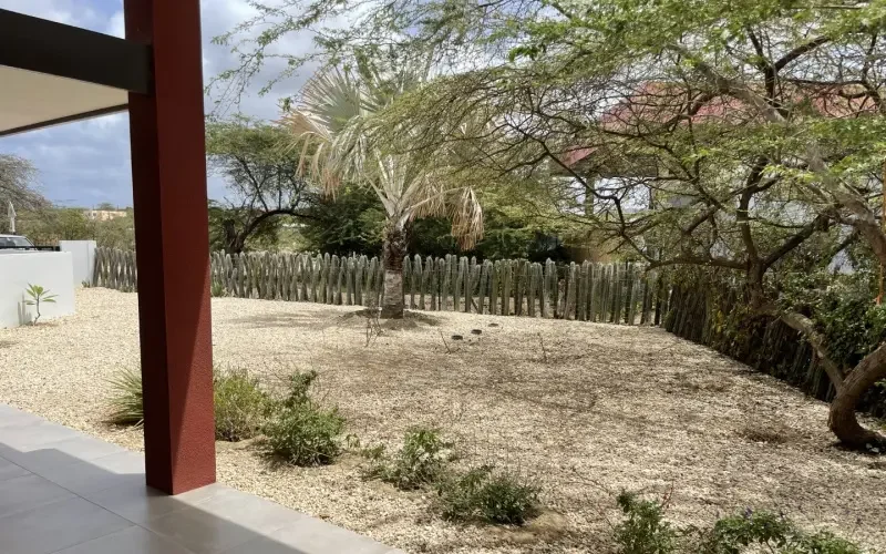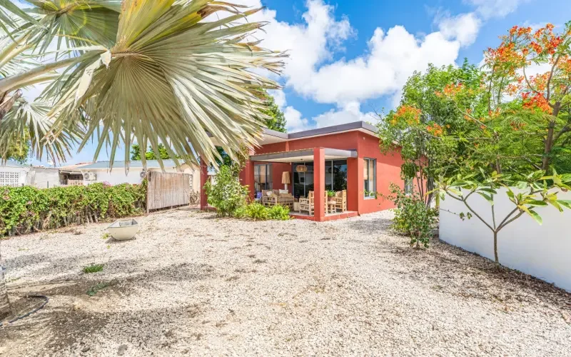 Aan de voor- en achterzijde bevindt zich de ruime tuin van de woning. Aan de voorkant van de woning is een porch waar ruimte is voor een lounge bank, perfect voor een kop koffie. Aan de achterzijde van de woning kom je bij het houten pooldeck met ingebouwd zwembad terecht om heerlijk af te koelen of te chillen met vrienden. Dit betreft een IGUI fiber zwembad. In de tuin staan tevens volgroeide planten, zoals een Bismarck palmboom.