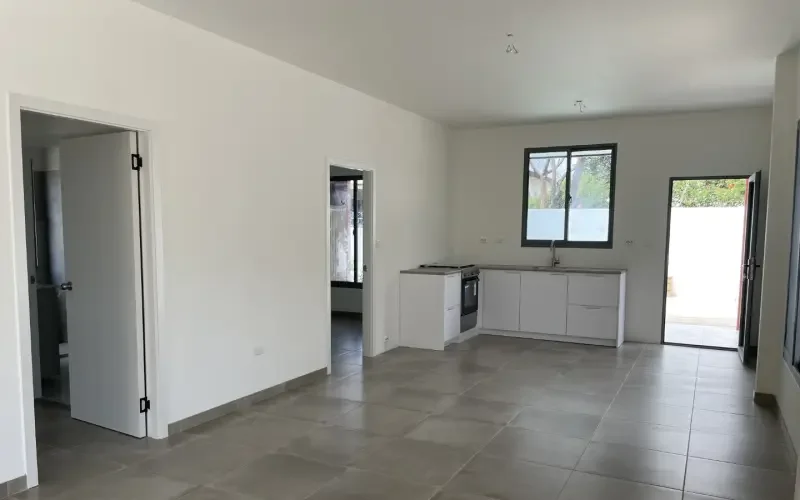 De woonkamer is verbonden met de open L-vormige keuken, er liggen moderne grijze vloertegels en er zijn schuifdeuren aan de terraszijde voor. In de woonkamer zijn twee plafondventilatoren.