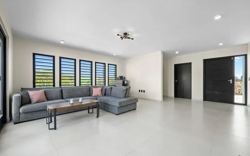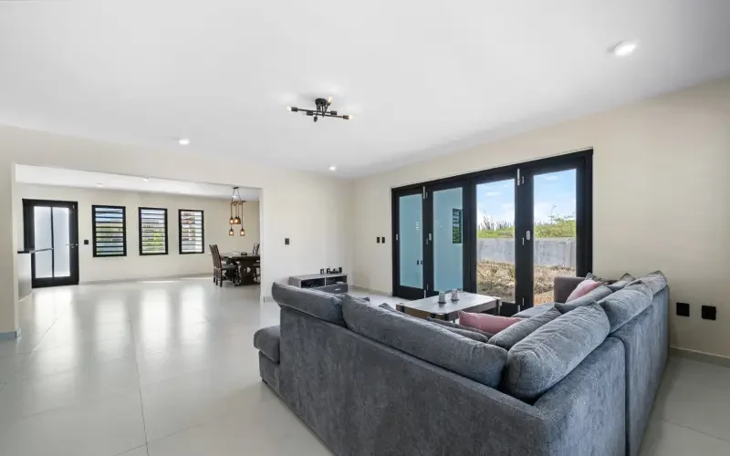 Via de looppoort kom je aan bij de entree van de woning. Je stapt direct de ruime woonkamer in met openslaande deuren naar de tuin. Ook heb je toegang tot de grote keuken met de achterdeur eveneens richting de tuin. De woonkamer is voorzien van veel licht door de vele ramen met shutters, hierdoor is er een zeer aangename breeze door te woning te voelen. De U-vormige keuken met kookeiland is voorzien van veel kastruimte en inbouwapparatuur, waaronder een inbouwoven, 5-pits-kookplaat en vaatwasser. Daarnaast is er een ruime eethoek aanwezig tegenover de keuken.