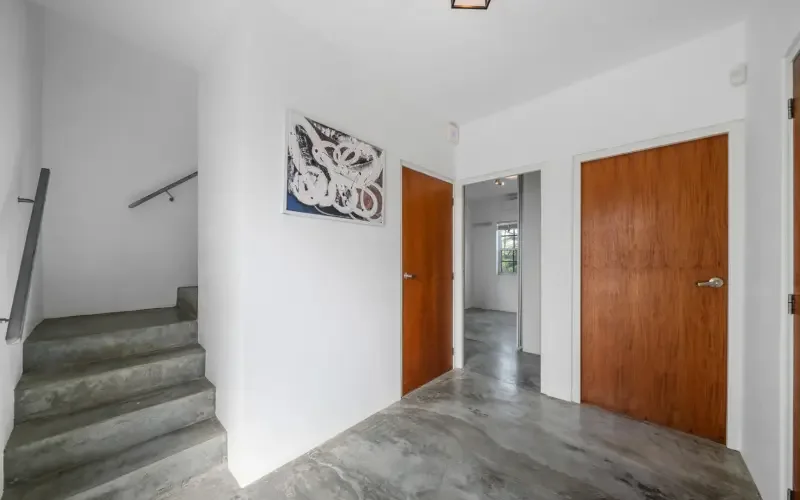 De centrale hal heeft een stenen kwartslag-trap naar de bovenverdieping, waar het woongedeelte is. De lichte woonkamer met veel ramen en een hoog plafond is ook voorzien van een airconditioner en twee ventilatoren. Schuifdeuren geven toegang tot het op de wind gelegen ruime balkon. Vanuit hier is er een wijds uitzicht. De L-vormige keuken is opgetrokken uit beton en voorzien van een vaatwasser en inbouwapparatuur, waaronder een inbouwoven en gasfornuis.