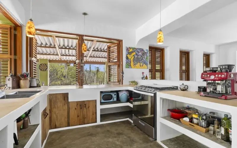 De ruime open keuken en woonkamer (31,5 m² / 339 ft²) bieden adembenemend uitzicht over de kunuku en de oostkust en stralen rust en een sterke verbinding met de natuur uit.De woonkamer leidt langs een kleine slaapkamer (8,75 m² / 94 ft²), momenteel in gebruik als studeer-/kleedkamer, maar ook zeer geschikt als derde slaapkamer.