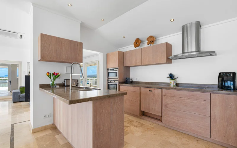 Vanuit de hal is er een deur naar de woonkamer met 360 graden view door alle ramen. Hier krijg je een indrukwekkend zicht op de oceaan. De keuken gemaakt uit licht eikenhout, heeft inbouwapparatuur van Europese kwaliteit. Daarnaast is er een bijkeuken waar ook de wasmachine staat. Achter het kookeiland is de eettafel en aan de porch zijde bevindt de woonkamer waar je tv kan kijken. De woonkamer loopt vloeiend over in de mooie overdekte porch met een bar en apart zitgedeelte om heerlijk te kunnen genieten van de zonsondergang. Hier kan je na een duik in het zwembad te hebben genomen, ook op de cabana heerlijk genieten overdag of in de avond.