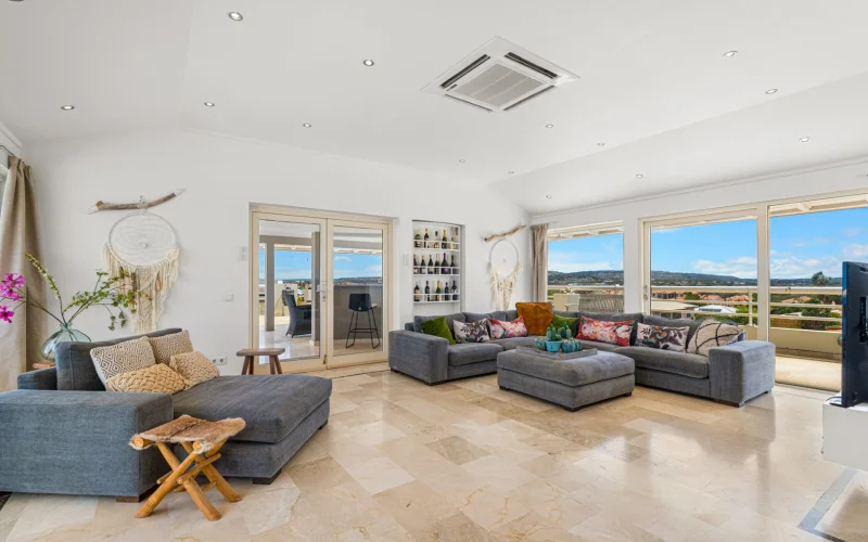 Wanneer je links de hal inloopt kom je bij de slaapkamers en aan de rechterkant ligt de luxe woonruimte met het terras en de porch. De woning is volledig voorzien van mooie lichte natuurstenen vloertegels.