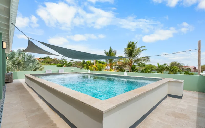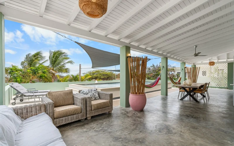 Lay-out Moderne woning (2018) met ruime woonkamer, U-vormige porch met zwembad, 3 slaapkamers en 2 badkamers. Het is gelegen in de populaire wijk Santa Barbara op een kavel eigendomsgrond van 960 m2. De woning heeft 2 parkeerplaatsen en een mogelijkheid om de auto achter het hek te zetten. Een pad van klinkers leidt naar de riante porch met enig zeezicht. Dit terras met hoog plafond biedt de mogel...