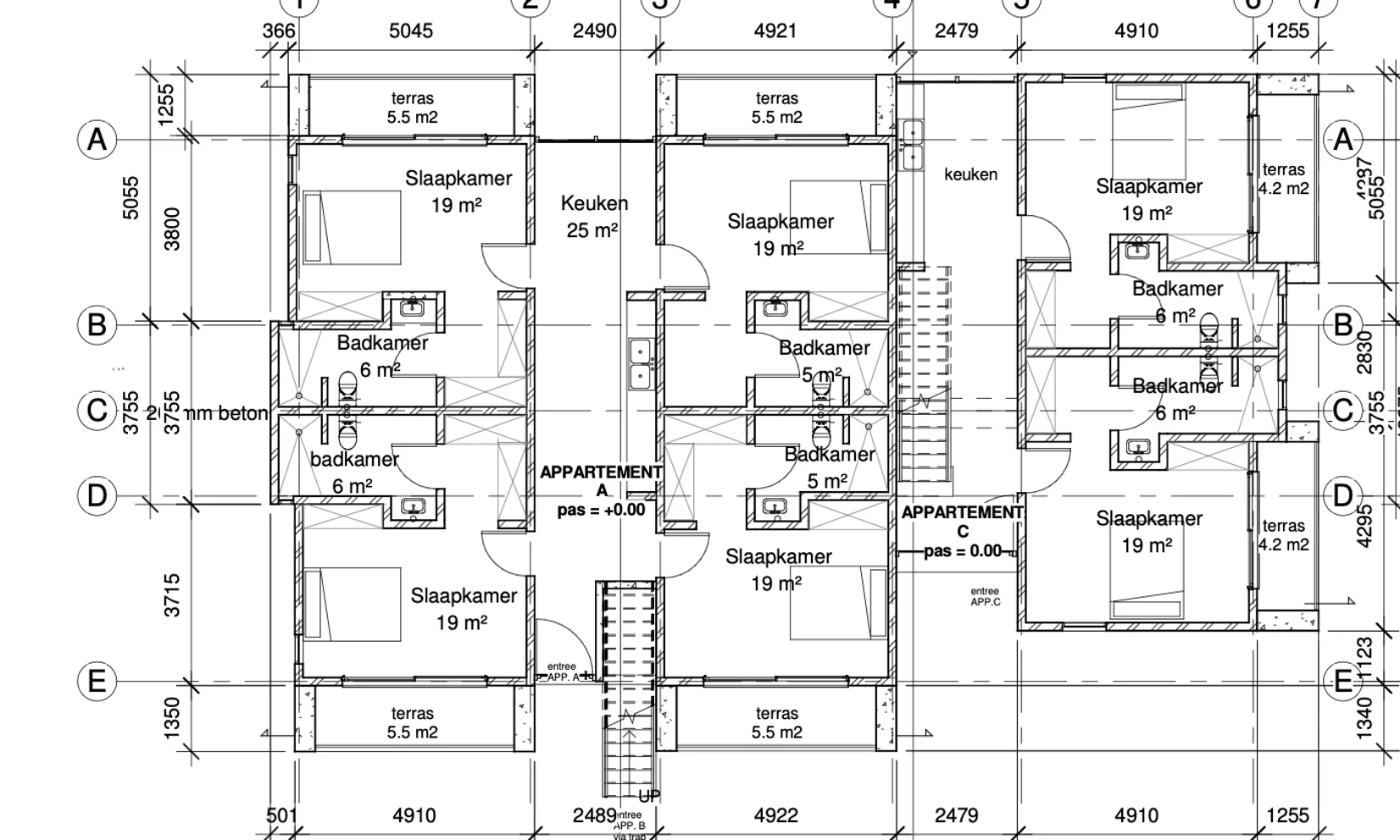 Appartement A en B bieden 165 m² woonoppervlak, terwijl appartement C met 190 m² extra ruimte biedt.